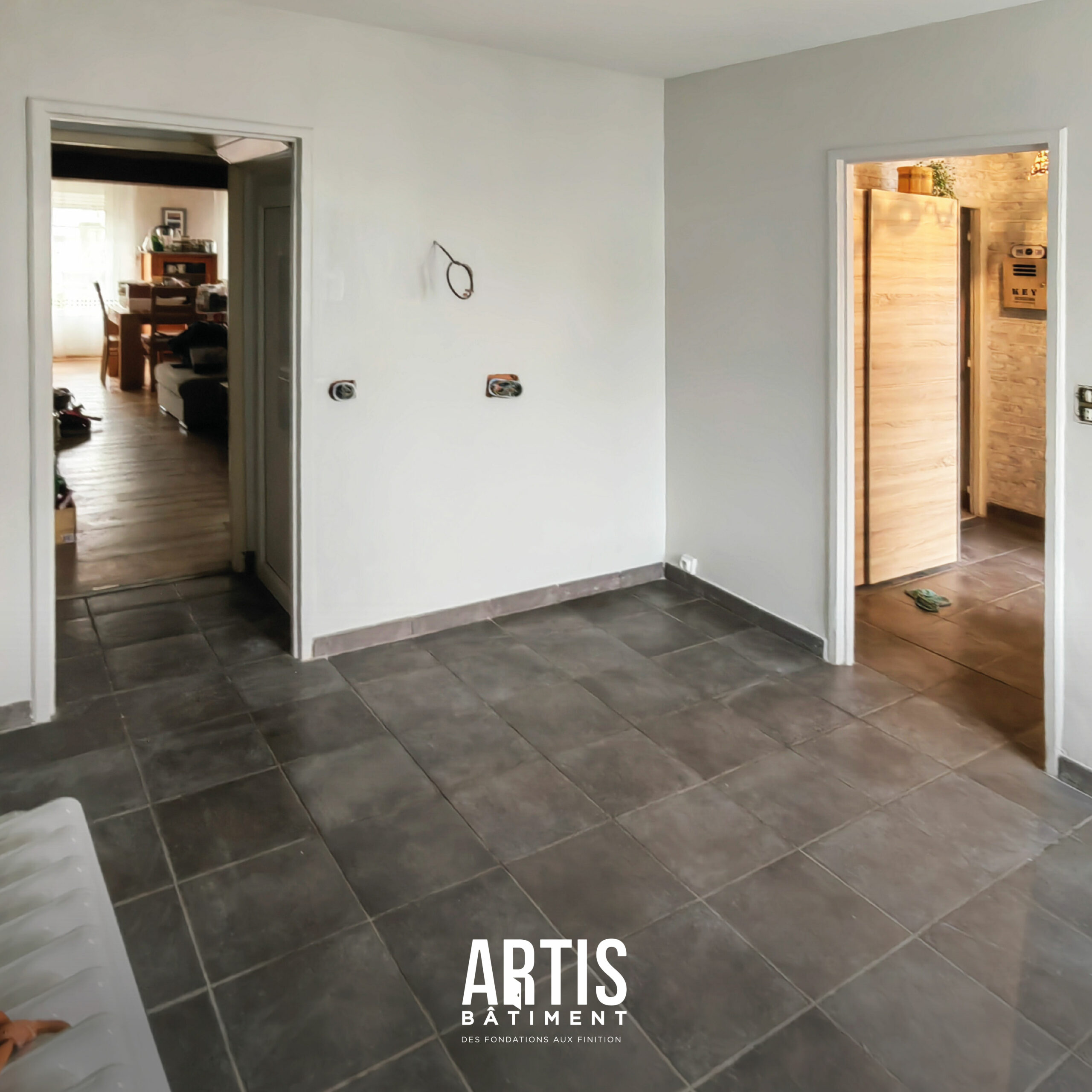 Nos équipes ont procédé au détapissage complet, permettant d’éliminer les anciens revêtements et de mettre à nu les supports. Cette opération est essentielle pour repartir sur une base propre.